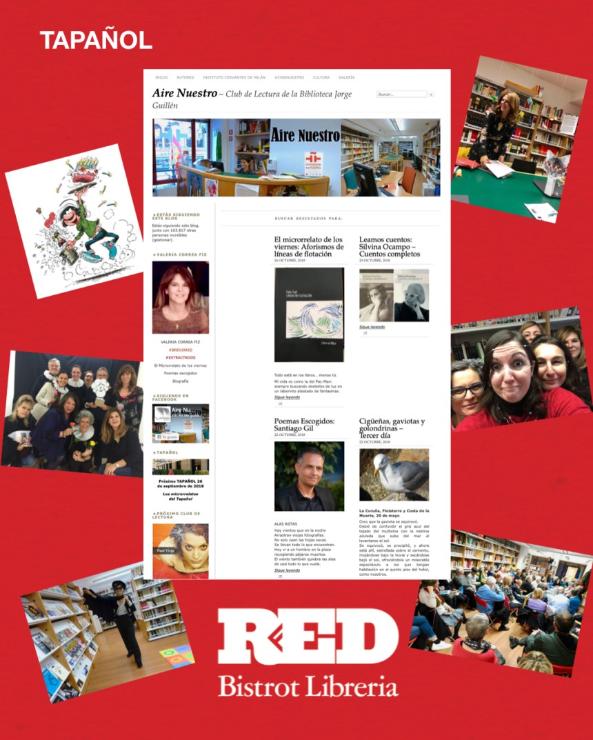 El reglamento del concurso de Microrrelatos: Mándanos un texto breve, máximo 300 palabras, antes del domingo precedente al Tapañol (a las 24:00 horas) a la siguiente dirección de correo: losamigosdecervantes@gmail.com. El lunes se publicarán los textos de forma anónima en el grupo Facebook «Los Amigos de Cervantes», en el grupo WhatsApp «Microrrelatos del Tapañol», y por correo electrónico a nuestra base de datos. Para formar parte de estos grupos, basta ser un usuario del Instituto Cervantes de Milán, inscribirse en la biblioteca o enviar un correo a losamigosdecervantes@gmail.com. Desde el momento de la publicación de los textos, cada usuario puede votar por correo electrónico (losamigosdecervantes@gmail.com.) o por WhatsApp en el grupo «Microrrelatos del Tapañol», el numero del micro preferido. Obviamente se puede votar una sola vez por usuario y no se puede votar a uno mismo. Confirmaremos cada voto recibido. Sobre las 19:00 horas, leemos los microrrelatos y las personas presentes en el Tapañol podrán también votar por WhatsApp si no lo han hecho previamente. Las votaciones se cerraran inmediatamente después y el premio TAPAÑOL RED será atribuido al microrrelato más votado. Premio Tapañol RED del 7/11/2018: |